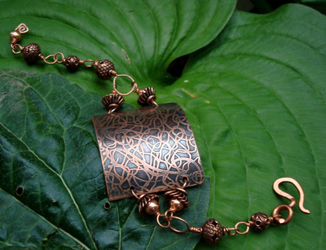 Cold Connections 1 ~ Rivets & Links or equivalent knowledge is required prior to this class. Knowledge of wire wrapping is helpful. Please bring files, pliers & your other favorite tools with you (please paint your tools with a stripe of your color nail polish for easy identification in classes). Copper sheet for your bracelet provided through class fee. Other metals available for an additional fee.