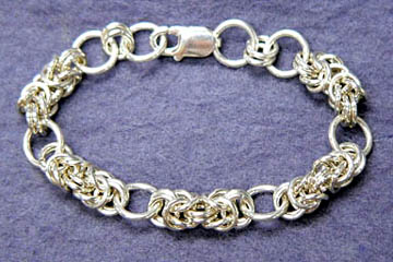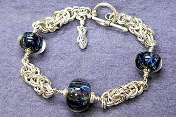 Create your own Byzantine weave bracelet (a chainmaille technique). Using ancient techniques, students will learn how to link sterling silver (or copper) rings together to form their own high end bracelet. Materials and tools to use during class will be provided. Bring a few coordinating lampwork or other beads to use as spacers. The technique may be expanded for necklaces (more materials needed) or minimized for use in earrings.