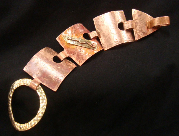 Make an artistic linked bracelet using only cold connections - no soldering needed! Design, fabrication, stamping and texturing metal will be explored while creating your one-of-a-kind bracelet. We will also touch on patinas and polishing to give your piece the finishing touch. If you want to incorporate etched copper into your design, bring your pre-etched copper sheet from the Copper Etching class.